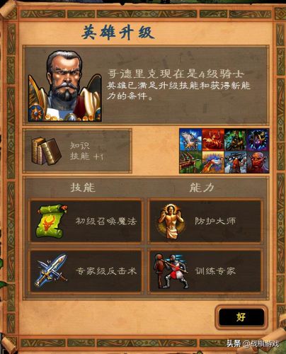 直接说太枯燥了,看看下图,是英雄升级的时候的截图。左边两个是技能。右边2个训练专家和防护大师就是能力。