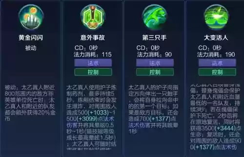 6、被动技能:黄金闪闪:周围有小兵或野怪死亡时,太乙真人和队友获得额外金币,有助于装备成型。一技能:意外事故:炼制药剂后爆炸,对周围敌人造成伤害并眩晕。炼制时间越长,伤害和眩晕时间越长,命中敌方英雄刷新技能。二技能:第三只手:伸出触手拉向触碰的单位,造成法术伤害和眩晕。